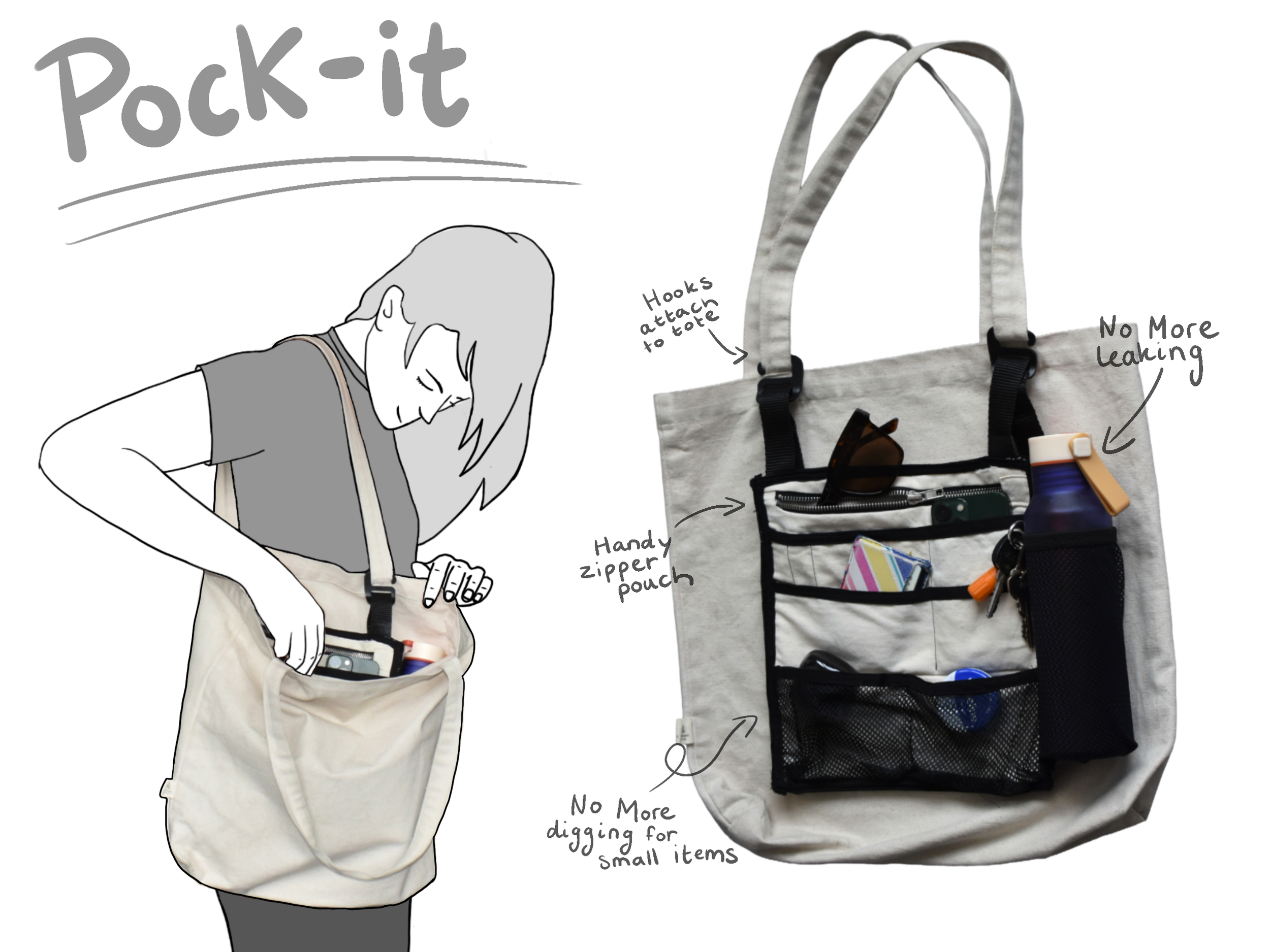 An innerbag specifically designed for totebags, so you won’t have to dig through the bottom of your bag to find your items. The Pock-it attaches to the straps of your (tote)bag. It contains handy pockets and a place to put your water bottle and keys. Being an avid totebag wearer I have struggled with the lack of pockets and with the issue of my water bottle falling over and leaking. I wanted to solve my problem and create a product that could be produced industrially. Therefor I looked at the design of the pockets of well known bag brands such as Fjallraven. I designed, marketed and sewn the bags myself.